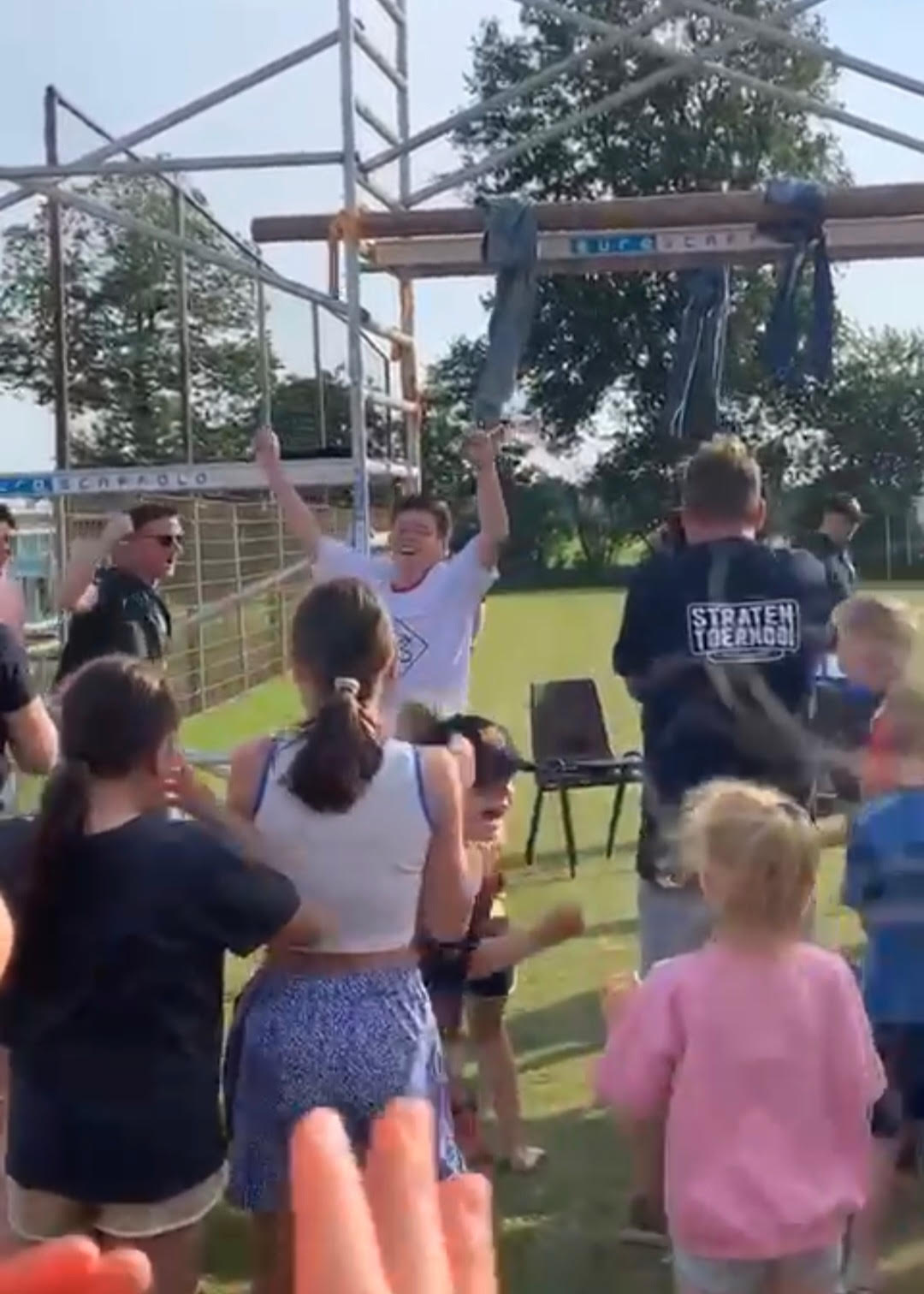 Op zondag was er het stratentoernooi nieuwe stijl. Sinds vorig jaar, toen voor het eerst na Corona weer een toernooi kon worden gehouden, is het de gewoonte om de feestavond direct na het toernooi te laten starten. De klassieke broodjes frikandel en kroket hebben plaatsgemaakt voor allerlei lekkere hapjes van John Verkoeijen die ook op zondag weer gretig aftrek vonden. Naast de sporten voetbal, korfbal en volleybal werd er gestreden met jeu de boules, een kracht en waterspel en natuurlijke de rode draad. De eerste jubileumboeken werden middags opgehaald in de feesttent bij bestuurslid Richard Janssen. Het stratentoernooi, wat steeds meer een gezellige reünie aan het worden is van (oud) Leunen-Veulen en Heidenaren, werd uiteindelijk gewonnen door de Steegsehaan. Sven Thijssen van Steegsehaan versloeg de twee andere finalisten tijdens de (halve)finale spijkerbroekhangen. De dag werd afgesloten met muziek van de live band NoColour.